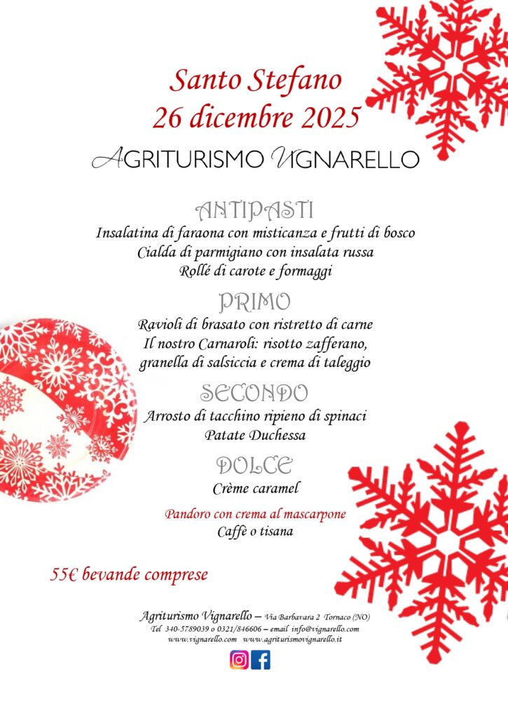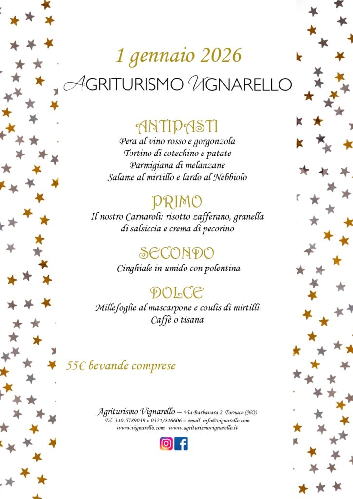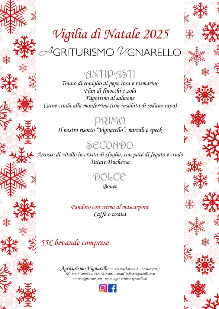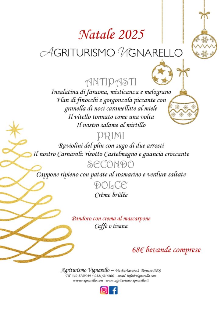Anche quest’anno all’Agriturismo Vignarello ci prepariamo alle festività natalizie con i menu “delle feste”! E non vediamo l’ora di accogliervi nelle sale ristorante della vecchia azienda agricola trasformata in agriturismo, nel cuore della frazione Vignarello di Tornaco (NO)!