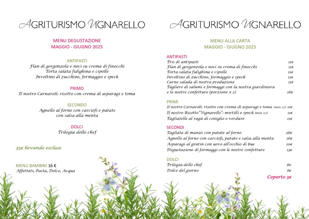 Insieme alle tante fioriture nella nostra azienda agricola, vi proponiamo il menu dell’Agriturismo Vignarello per i mesi di maggio e giugno: come ogni mese due risotti, sempre con il nostro Carnaroli, le nostre erbe aromatiche e i nostri mirtilli abbattuti alla raccolta. Come d’abitudine, poi, proponiamo ingredienti stagionali per un menu del mese che segua il ritmo della natura.